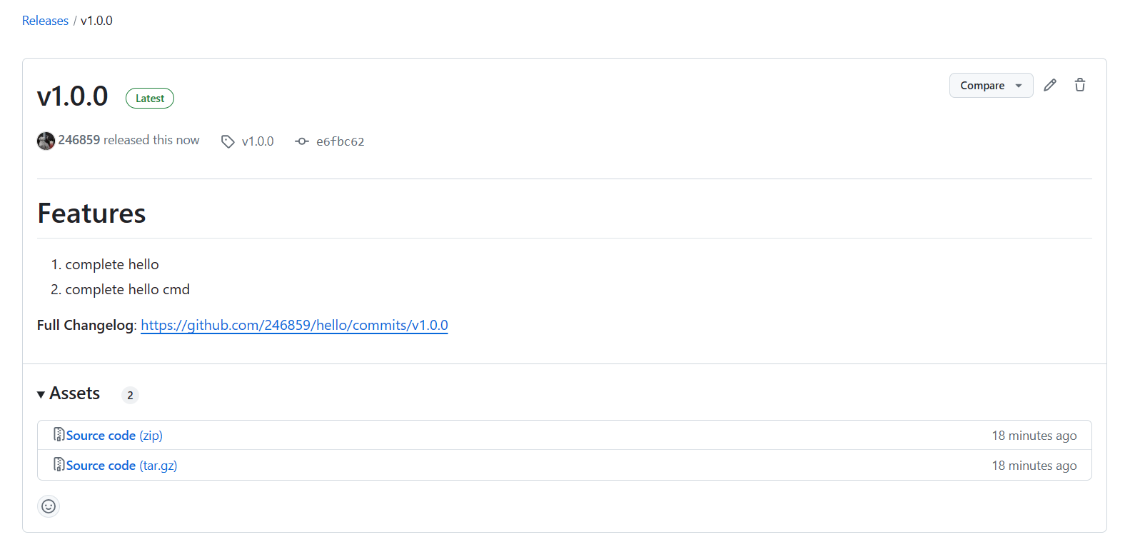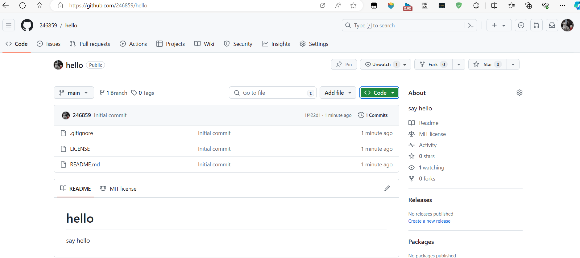 After creation, you can see the repository URL is https://github.com/246859/hello, and the corresponding go module name is github.com/246859/hello.