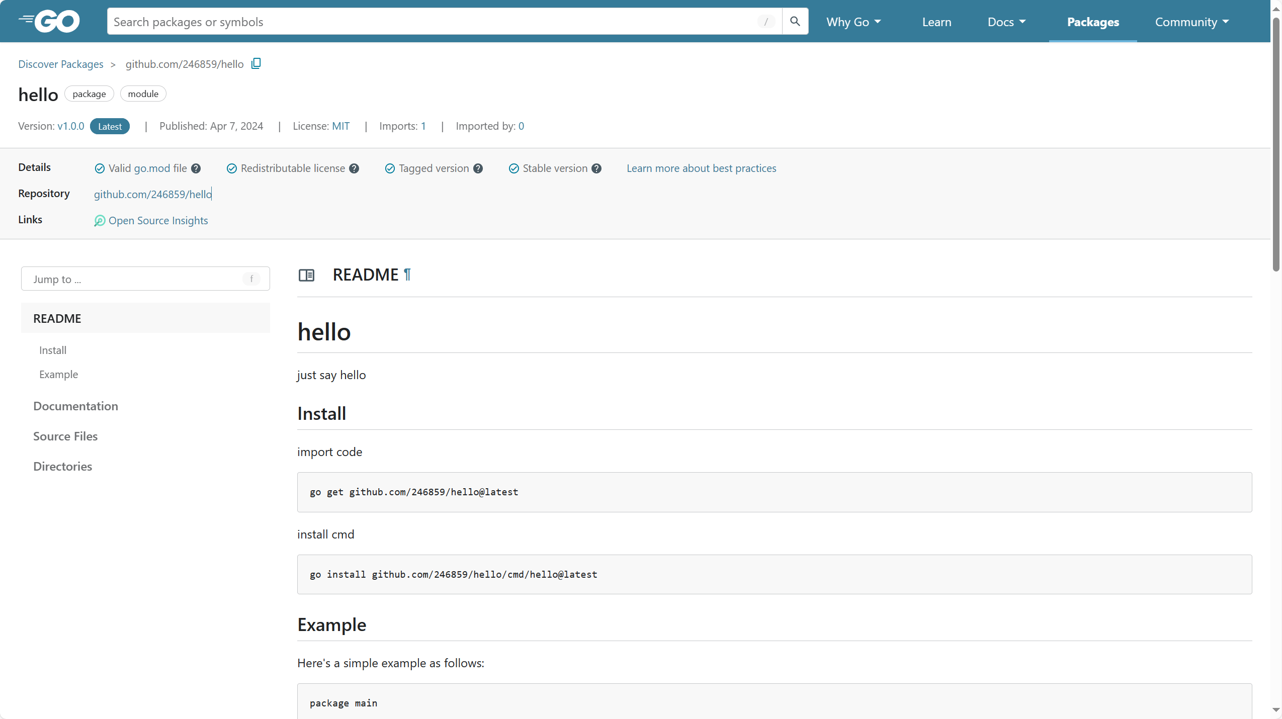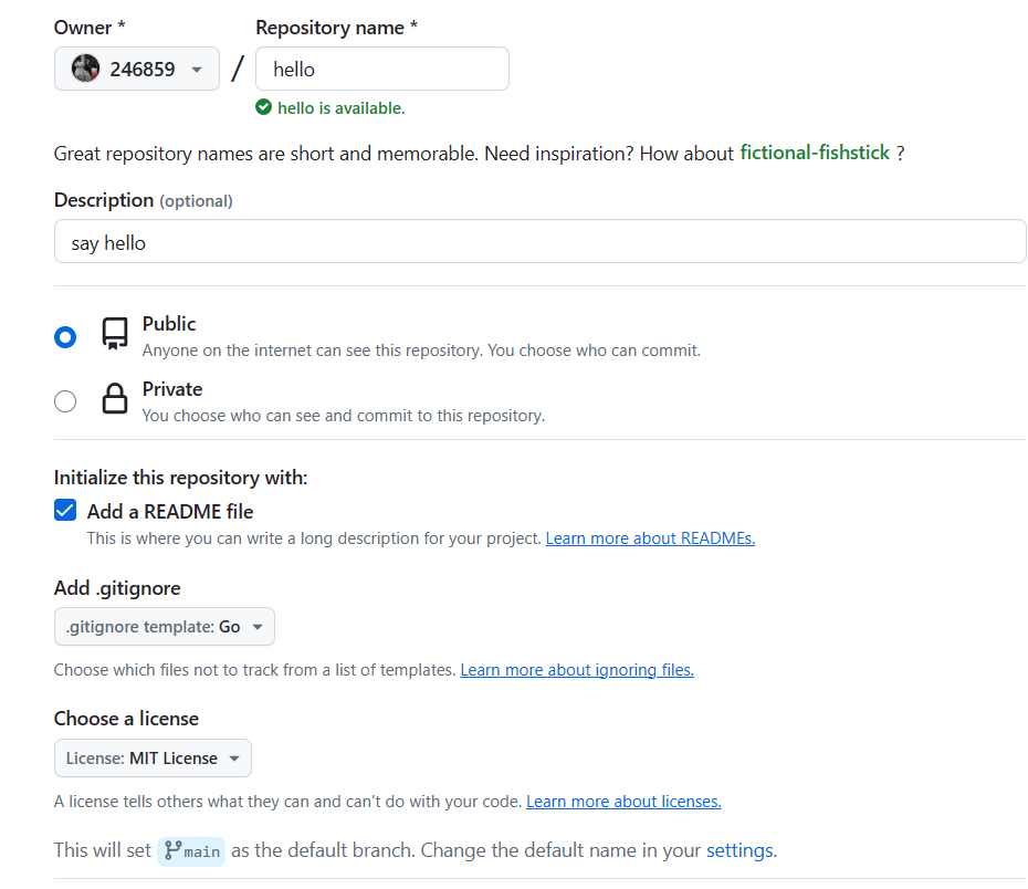 First, you need a publicly accessible source code repository. There are many choices. I recommend Github. Create a new project on it, name it hello. Although there are no special restrictions on repository names, it's recommended not to use special characters as this will affect the module name.