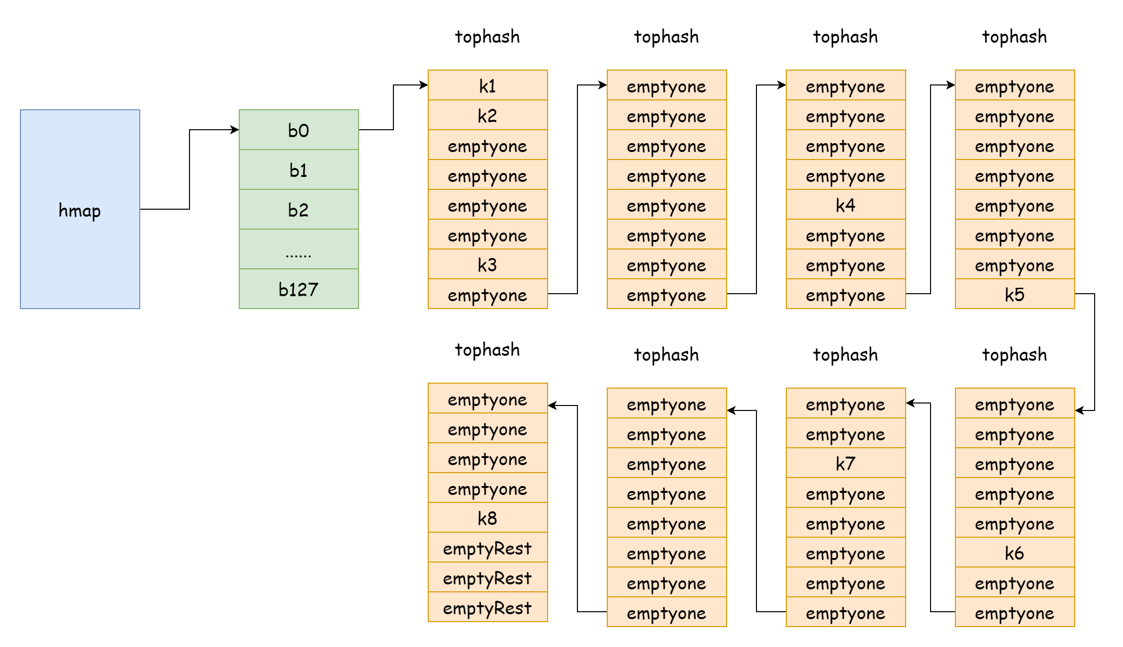 tophash: stores the high 8 bits of each key. For a tophash element, there are the following special values:goconst ( emptyRest = 0 // Current element is empty, and no more available keys follow emptyOne = 1 // Current element is empty, but there are available keys following evacuatedX = 2 // Appears during expansion, only in oldbuckets, indicates element was moved to upper half of new bucket array evacuatedY = 3 // Appears during expansion, only in oldbuckets, indicates element was moved to lower half of new bucket array evacuatedEmpty = 4 // Appears during expansion, element itself is empty, marked during relocation minTopHash = 5 // Minimum tophash value for a normal key-value )If
