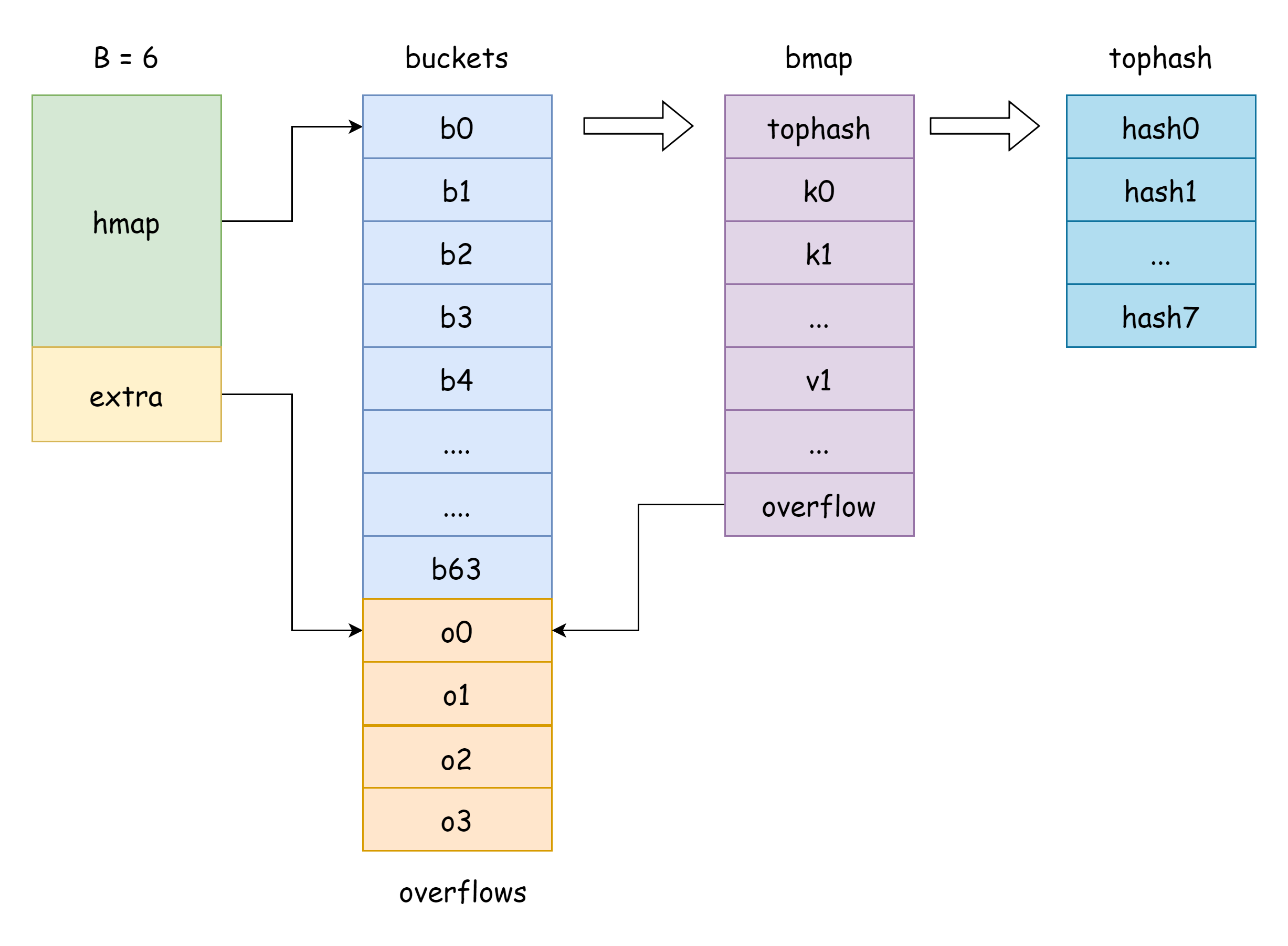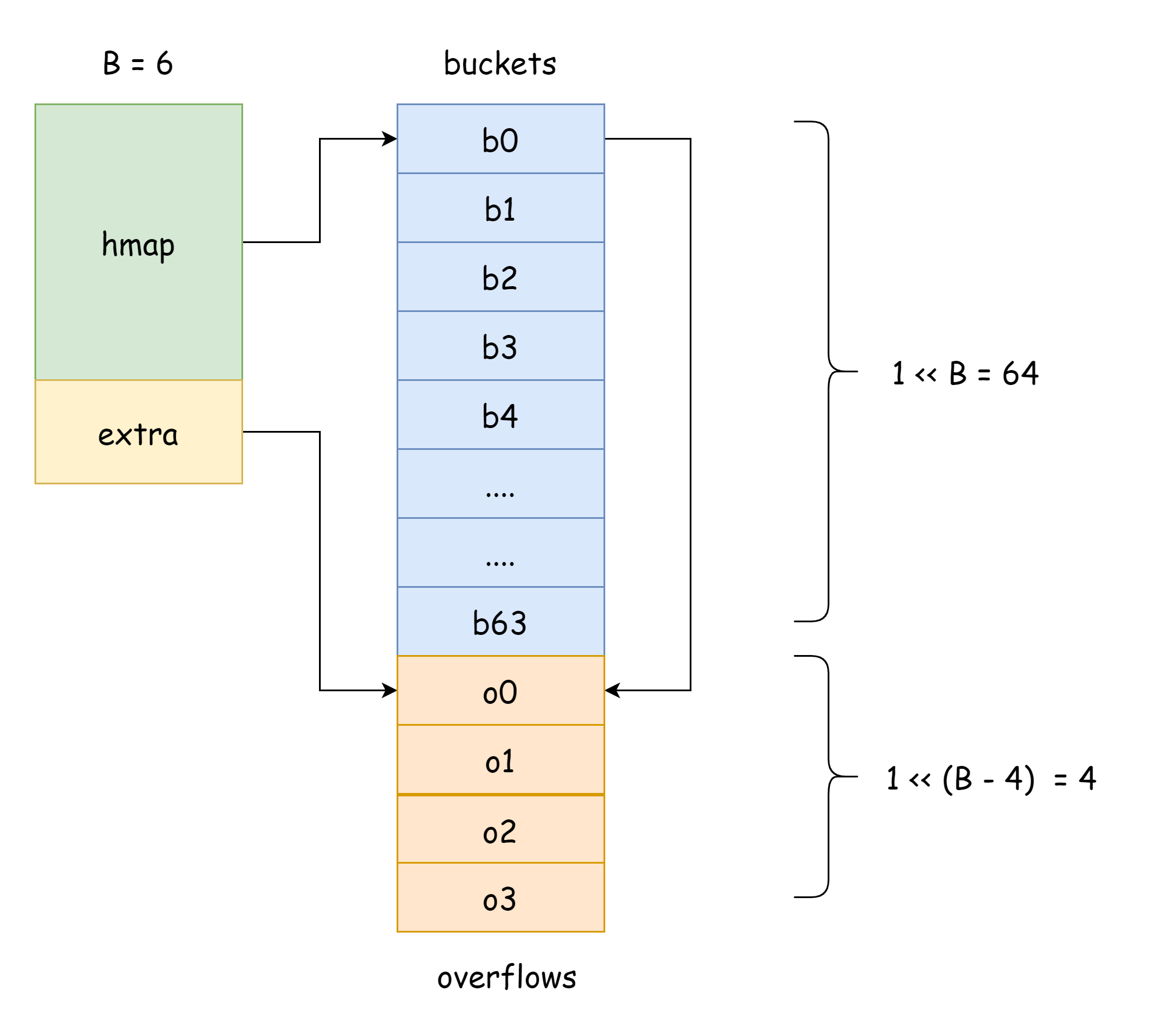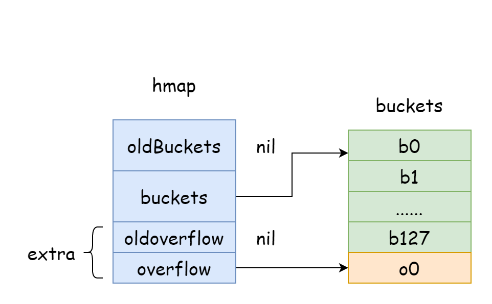 In hmap, there's a field extra specifically for storing overflow bucket information. It points to a slice storing overflow buckets, with the following structure:
