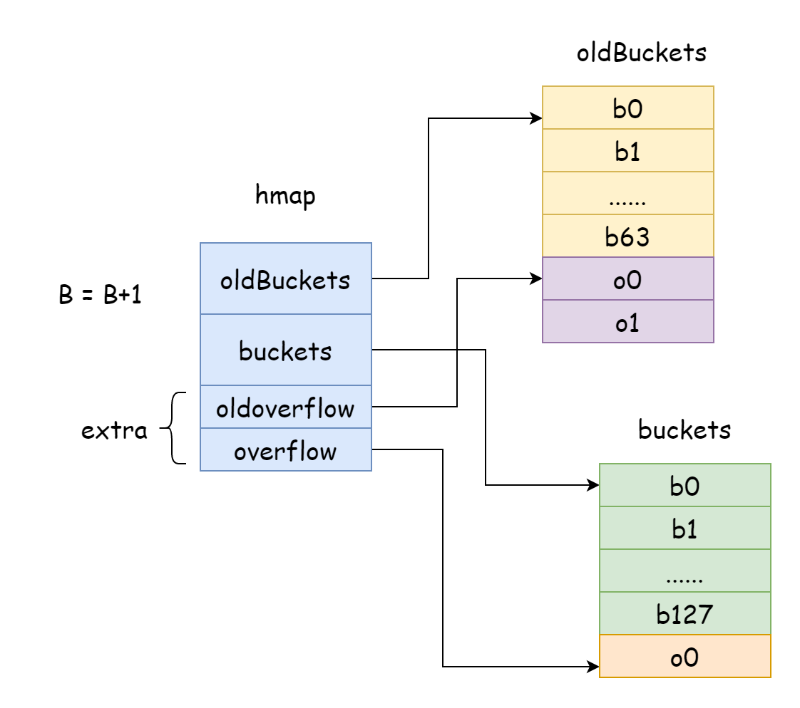 count: represents the number of elements in hmap, equivalent tolen(map).flags: hmap flags indicating what state the hmap is in, with the following possibilities:goconst ( iterator = 1 // Iterator is using buckets oldIterator = 2 // Iterator is using old buckets hashWriting = 4 // A goroutine is writing to hmap sameSizeGrow = 8 // Growing with equal size )B: the number of hash buckets in hmap is1 << B.noverflow: approximate number of overflow buckets in hmap.hash0: hash seed, specified when hmap is created, used to calculate hash values.buckets: pointer to the hash bucket array.oldbuckets: pointer to the hash bucket array before hmap expansion.extra: stores overflow buckets of hmap. Overflow buckets are new buckets created when the current bucket is full to store elements.