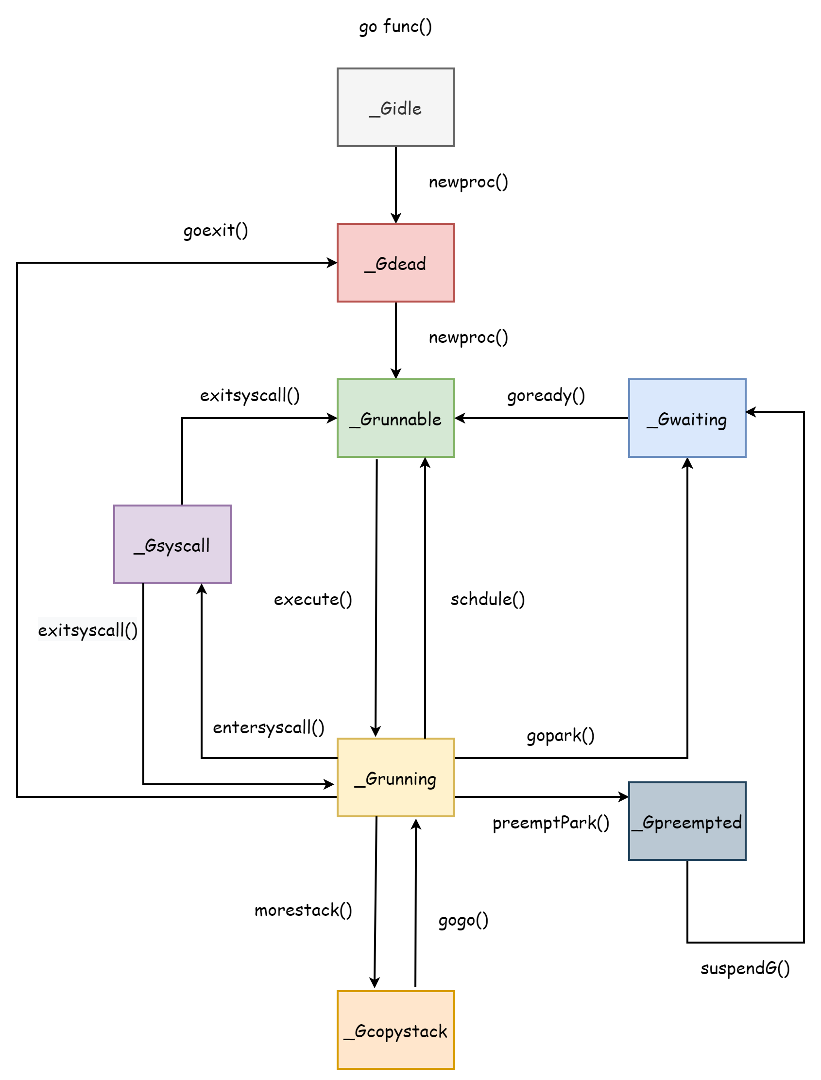 }Finally, it goes to runtime.gopreempt_m() to voluntarily yield the current coroutine's execution rights. First, cut the connection between M and G, status becomes _Grunnable, then put G into the global queue, and finally enter the scheduling loop to yield execution rights to other G.