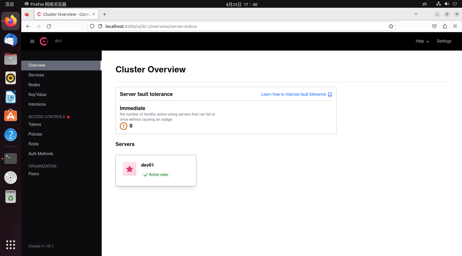 $ consul agent -dev -bind=192.168.48.141 -data-dir=/tmp/consul -ui -node=dev01Typical output is as follows: